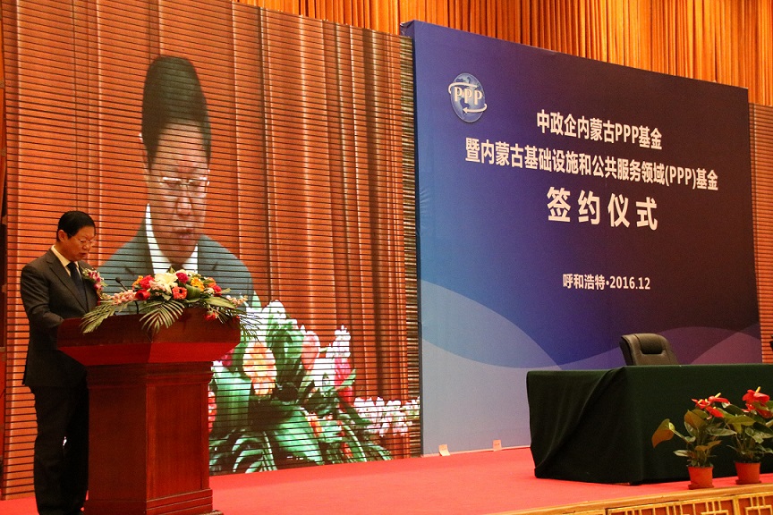 2016年12月27日,中政企内蒙古PPP基金、内蒙古基础设施和公共服务投资引导基金两支PPP重磅基金在呼和浩特市签约落地。自治区副主席王波、中国政企合作投资基金股份有限公司董事长周成跃、自治区财政厅厅长张华、呼和浩特市市长李杰翔等出席签约仪式。