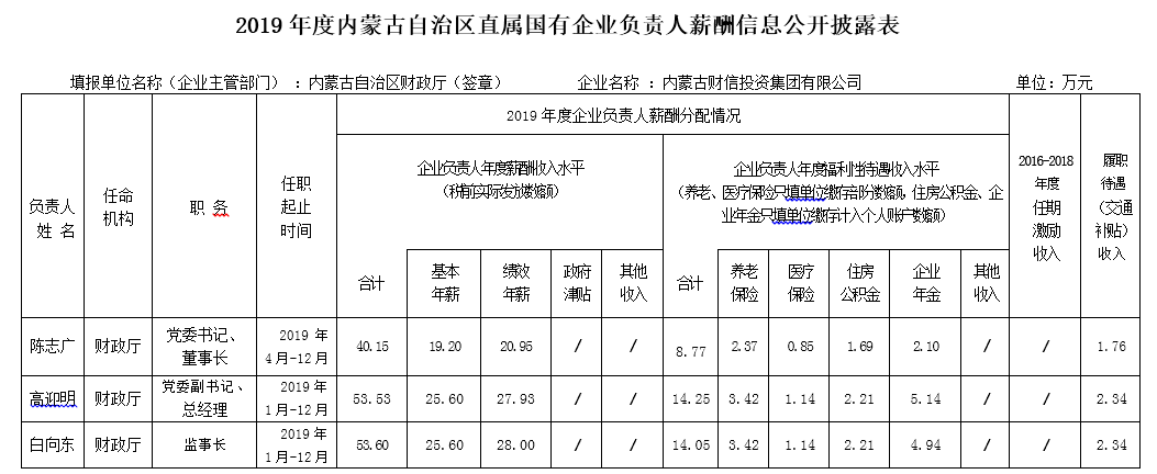 2019年度内蒙古自治区直属国有企业负责人薪酬信息公开披露表