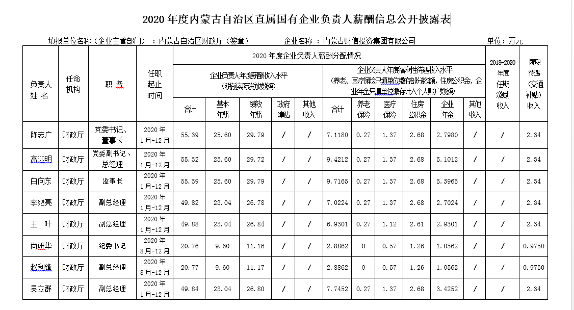 2020年度内蒙古自治区直属国有企业负责人薪酬信息公开披露表