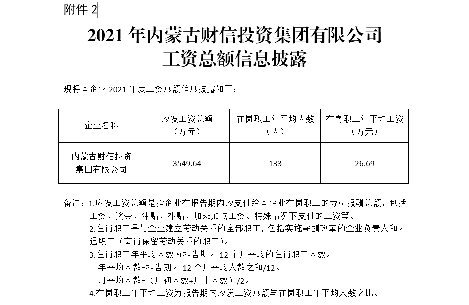2021年内蒙古财信投资集团有限公司 工资总额信息披露