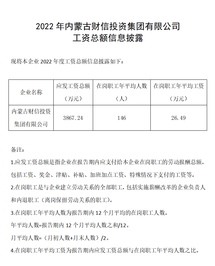 2022年内蒙古财信投资集团有限公司工资总额信息披露